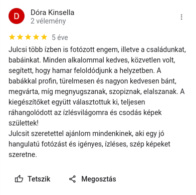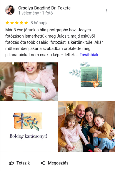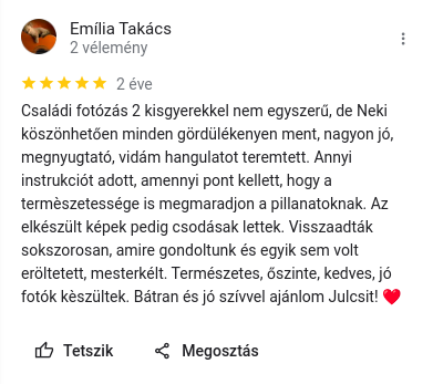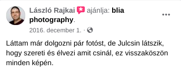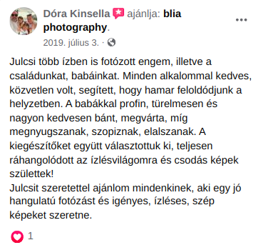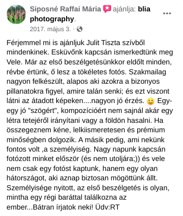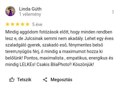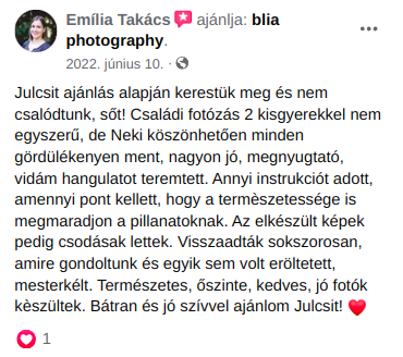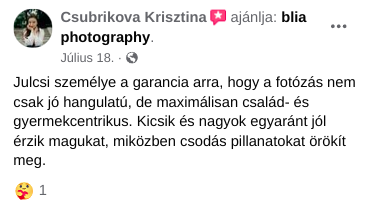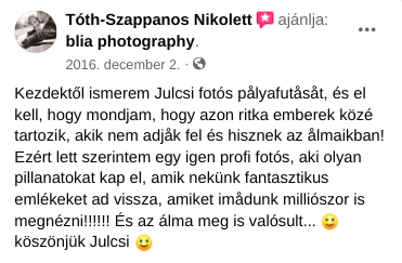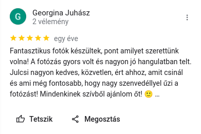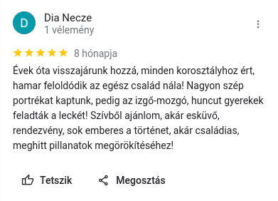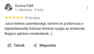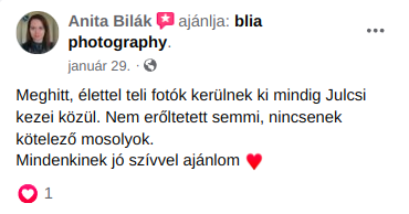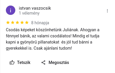 Nálam a fotózás iránti érdeklődés felnőttkorban kezdődött. Észrevétlenül gyűrűzött be egyetemi éveim alatt, legelőször az utazásaimba. Azon kaptam magam, hogy amíg a barátnőim az Eiffel-torony vagy más nevezetességek előtt fotózkodtak, addig én az érdekes árnyékokat és részleteket kutattam, és más típusú képekkel raktam tele az akkor még kompakt fényképezőgépem memóriakártyáját. Ezután kezdett el érdekelni a tükörreflexes gép, a lencsék világa és kezdtem el próbálgatni családi eseményeken az érdekesebb pillanatok megörökítését. Ennek már több mint 10 éve, de a lelkesedés és a rajongás a fotózás iránt a mai napig változatlan. Az tölt el boldogsággal, ha Te csillogó szemmel nézed vissza a családi fotózás képeit, vagy a hónapokig szervezett rendezvényeid fotóit (legyen az esküvő vagy céges buli, konferencia vagy családi születésnap), és újra meglátod benne azt, amit akkor átéltél, éreztél.